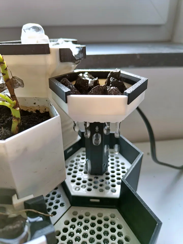 This Modular Desk Fountain is 3d printed to perfection. We use material that can resist water for years and maintain its color even in the outdoors. Setup your garden with it or simply place it on a corner table. You can also add it to your work desk for a peaceful background sound. The water flowing through the rocks generates such a peaceful vibe that you’d want one for every room in your home.You can customize this zen fountain with different accessories. You can add a lion or go for a planter. A waterwheel or a tiny working mill gives it a very realistic look. Customize number of hexes (size), height of hexes, and colors of your own choice. You can also choose colors for accessories.